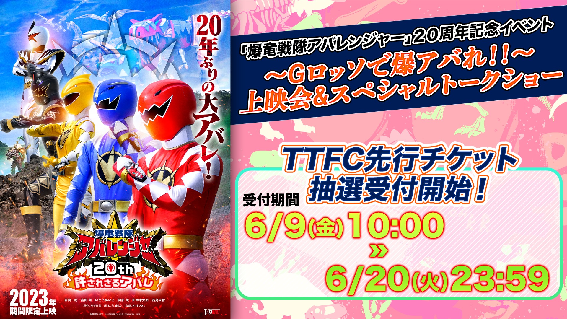 7月15日にGロッソにて開催される「『爆竜戦隊アバレンジャー』20周年記念イベント~Gロッソで爆アバれ!!~上映会&スペシャルトークショー 」の東映特撮ファンクラブ(TTFC)会員向け先行抽選販売の実施が決定いたしました!