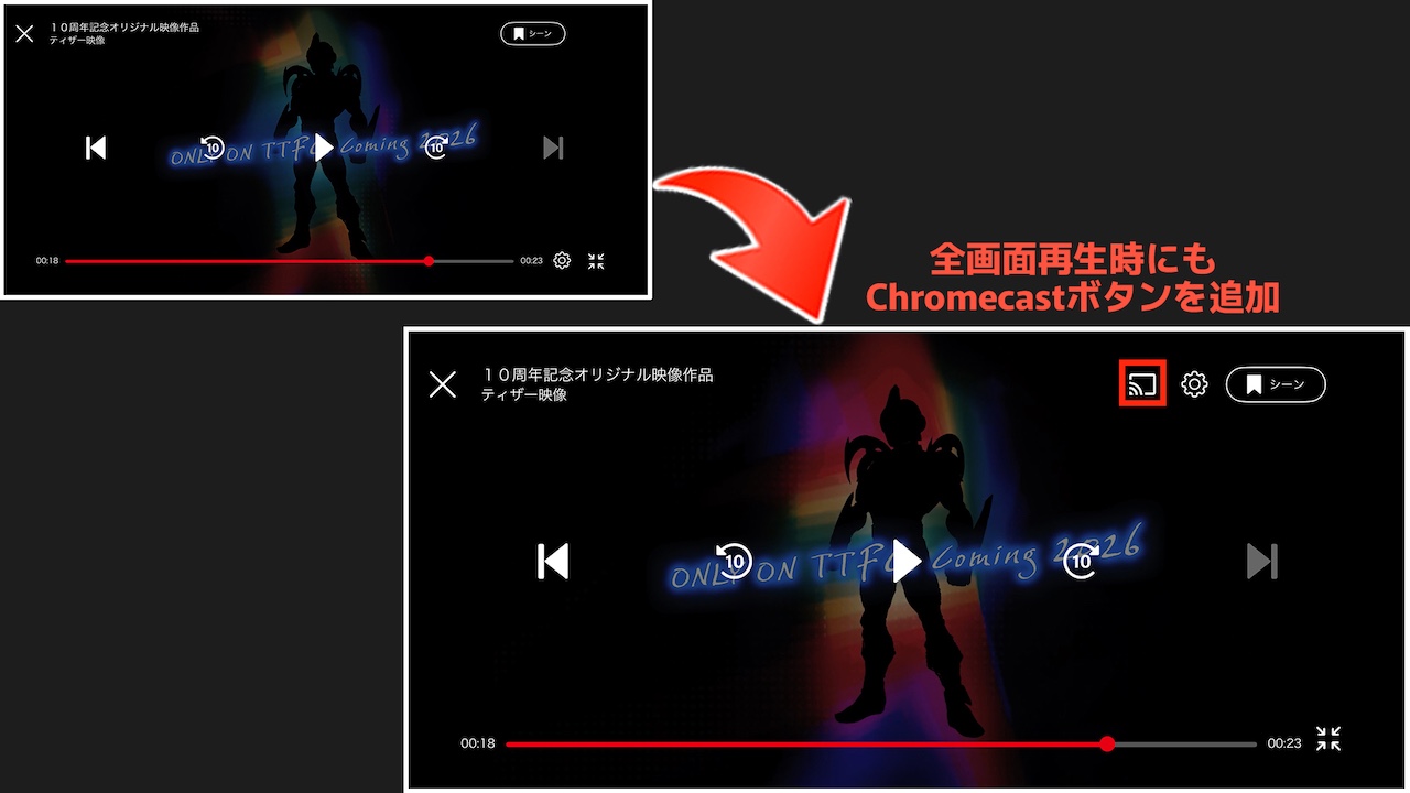 これまで、縦画面再生時のみに表示されていたChromecastボタンを、全画面再生時の画面にも表示するよう改善しました。