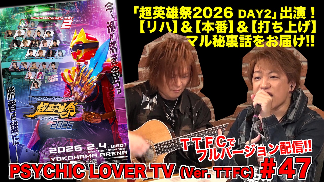 今年も「超英雄祭 KAMEN RIDER × SUPER SENTAI LIVE & SHOW 2026」の「DAY2 -SUPER SENTAI 50th-」で熱唱&激奏したサイキックラバー。出演者ならではの、リハーサル&本番ステージ、さらには打ち上げのマル秘裏話を披露します! イベントに参加していた方はもちろん、スーパー戦隊ソングファンもお楽しみ頂けること間違いなし!