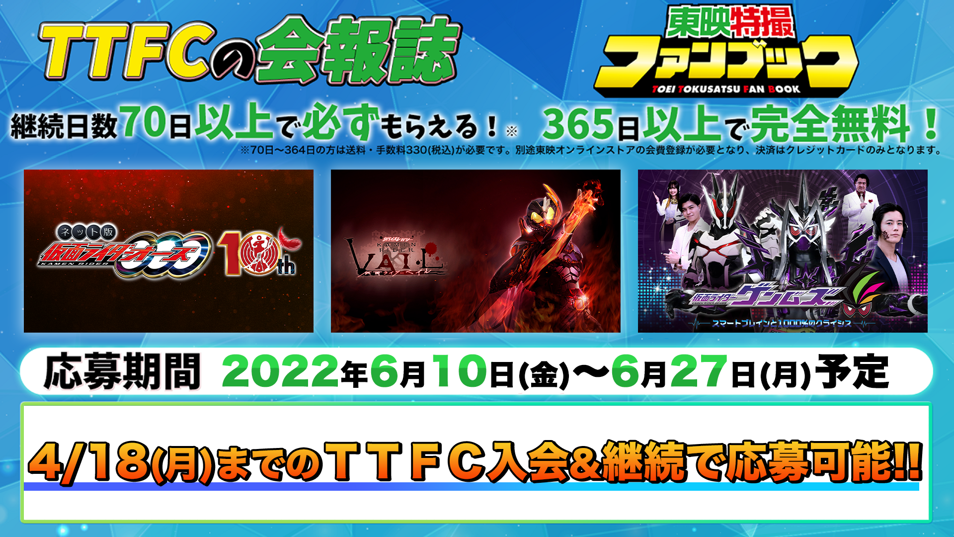 ご応募には上記期間内にTTFCの会員(有料)継続日数が70日以上であることが必要です。