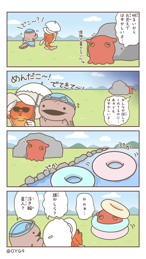 「およげないん」は、なぜかおよげなくなってしまった9匹の水の生きものたちの物語。各SNSで1コマ漫画、4コマ漫画が毎週月・火・水・金の午前9時から配信されています。