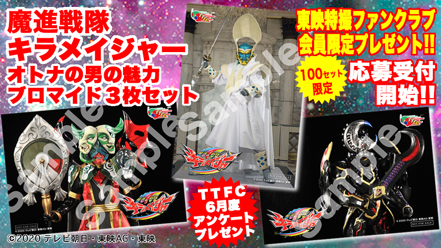 マブシーナのブロマイド(東映特撮ファンブック最新号に付録、受付終了)の好評を受け、『魔進戦隊キラメイジャー』より新たに3キャラクターのブロマイド化が決定! オラディン、ガルザ、クランチュラのオトナの男の魅力3枚セット! 東映特撮ファンクラブ(TTFC)会員限定で100名様にプレゼント!!