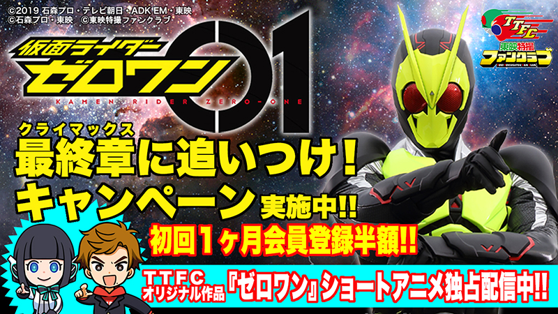 いよいよ最終章(クライマックス)に突入するテレビシリーズの『仮面ライダーゼロワン』! 東映特撮ファンクラブ(TTFC)では新規に会員登録される方を対象に、最初の1か月間*が通常の半額となる480円(税込)でお楽しみいただける<ゼロワン
