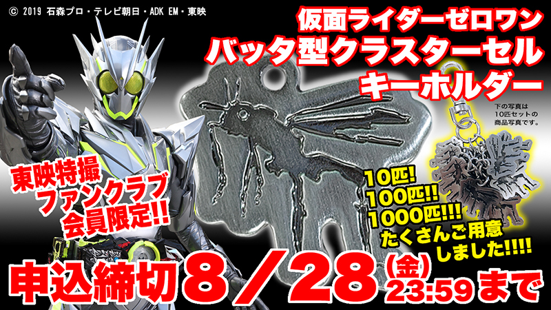 話題沸騰の「仮面ライダーゼロワン バッタ型クラスターセルキーホルダー」!! 仮面ライダーゼロワン メタルクラスタホッパーが従えるバッタ型のクラスターセルをキーホルダーにしました。注文受付はTTFC会員限定で8月28日(金)23:59まで! 締切間近!!