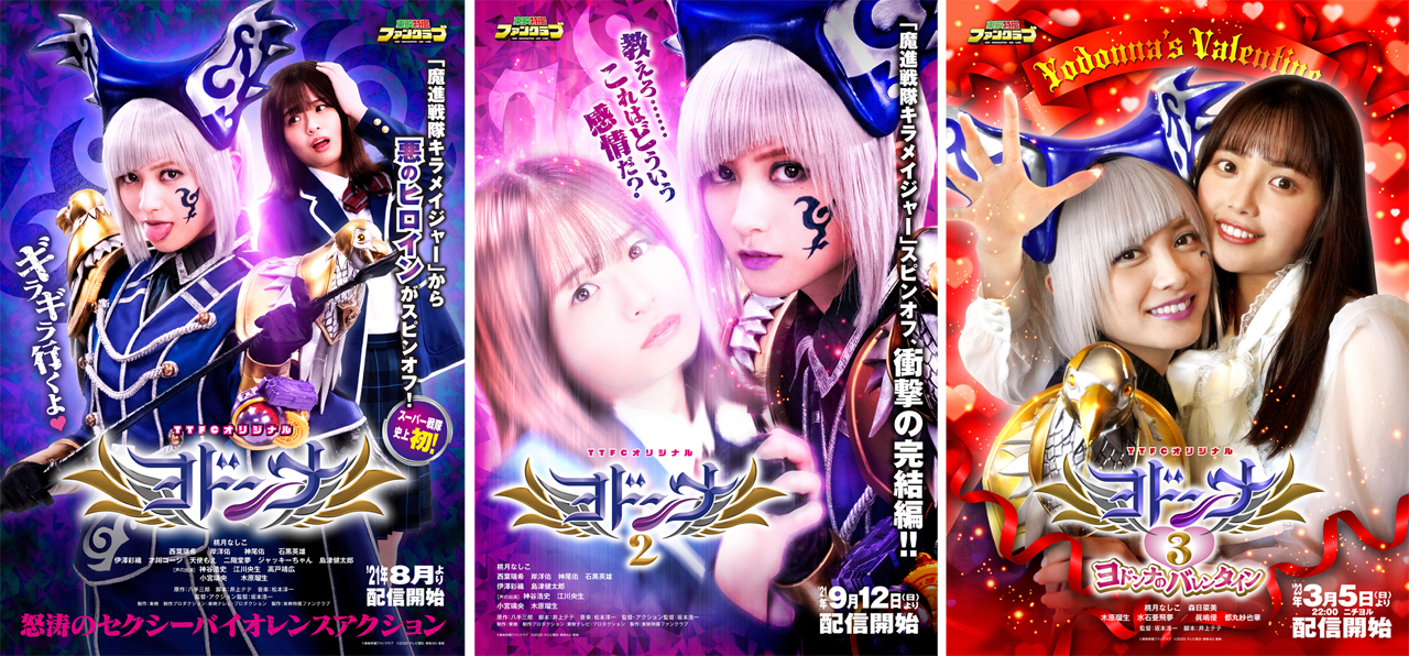 『ヨドンナ』シリーズは、2020年3月~2021年2月まで放送のテレビシリーズ『魔進戦隊キラメイジャー』に登場した悪の幹部、【ヨドンナ(演:桃月なしこ)】が主役のスピンオフ作品。TTFCにて2021年から『ヨドンナ』『ヨドンナ2』が、2023年から『ヨドンナ3 ヨドンナのバレンタイン』が配信されています。テレビシリーズでは消滅したヨドンナでしたが、この3作品で「喜怒哀楽」と「愛情」を知り、無事に生き返ったところで物語は終わりました。
