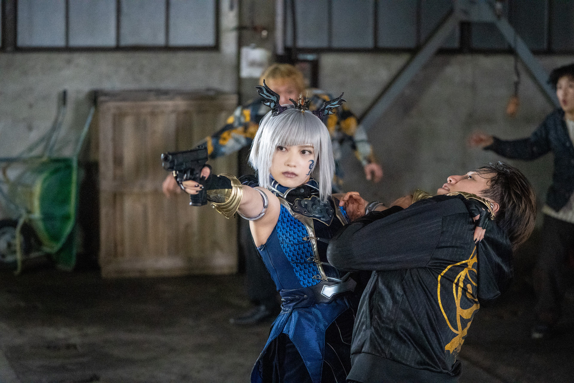『ヨドンナ』『ヨドンナ2』では【柿原さん(演:西葉瑞希)】、『ヨドンナ3 ヨドンナのバレンタイン』では【ミコ(演:森日菜美)】の体を借りて実体化していたヨドンナ。生き返った彼女はもう他人の体を借りる必要はなく、ヨドンナとして他の人間たちと交流していきます。今作『ヨドンナ THE FINAL』では、たまたま居合わせた銀行強盗団の4人、【ローズ】【マーガレット】【サルビア】【ダリア】と行動を共にすることに…。ローズ役には『仮面ライダーセイバー』(2020年)にて神代玲花/仮面ライダーサーベラを演じた【アンジェラ芽衣】が、サルビア役には【十味】、マーガレット役には【新谷姫加】、ダリア役には【まるぴ】。ヨドンナ演じる桃月なしこと同じ、ゼロイチファミリア所属の4人の女優が出演いたします。本作もメガホンをとる坂本浩一監督・アクション監督によるアクションシーンもみどころです。