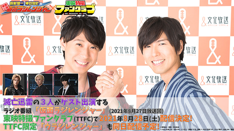 8月27日(金)、文化放送にて放送されるラジオ番組『東映公認 鈴村健一・神谷浩史の仮面ラジレンジャー』に、『仮面ライダーゼロワン』で活躍したサイバーテロリスト集団「滅亡迅雷.net」から3人のキャスト ───── 滅/仮面ライダー滅役の砂川脩弥さん、雷/仮面ライダー雷役の山口大地さん、亡/仮面ライダー亡役の中山咲月さんがゲスト出演することが決定! さらに、この放送回をTTFCでアーカイブ配信することも決定しました。ラジオ放送では聴くことができないTTFC限定配信のアフタートーク『ウラジレンジャー』も配信します!!