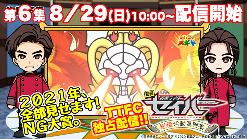 『仮面ライダーセイバー』のショートアニメ、『別冊 仮面ライダーセイバー 短編活動萬画集』の第6集は8月29日(日)10:00より、東映特撮ファンクラブ(TTFC)で会員見放題配信開始! 『短編活動萬画集』もついに最終回! 今までに登場した全キャラクターが再登場します!!